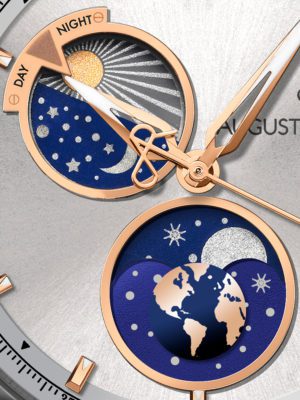 The sandblasted black dial includes two fine metal rings encircling the day and night indicator and the moon phase and a date window at 3 o’clock. The Unity Day & Night watch is distinguished by its numerous details: the styling of the markers, the compass-inspired hands and the second hand adorned with the Auguste Reymond emblem.