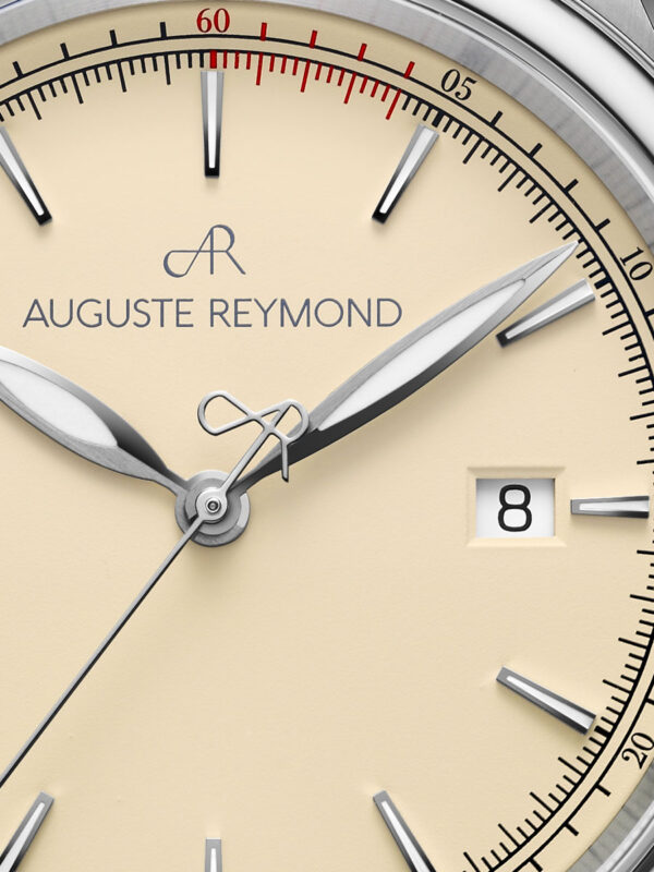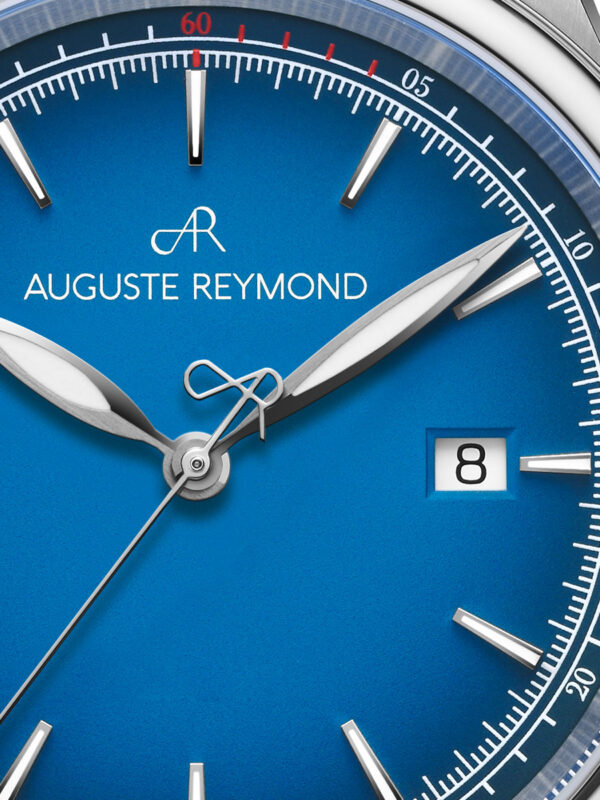 The seconds hand, adorned with the Auguste Reymond logo, alternately reveals the initials of the company and the infinity symbol.